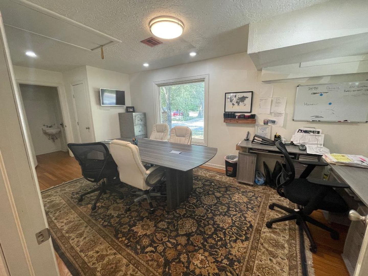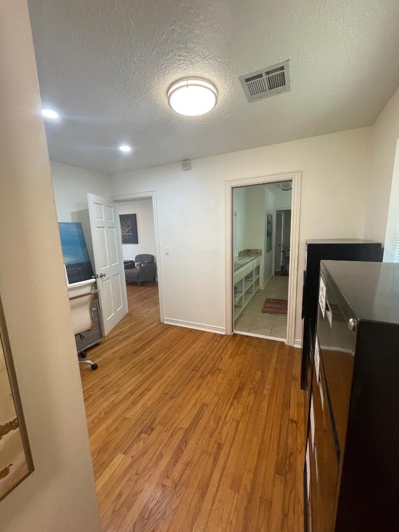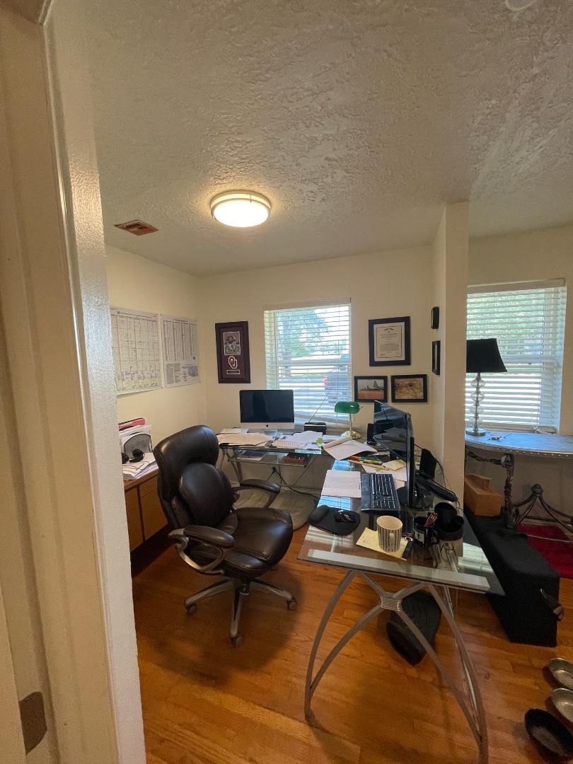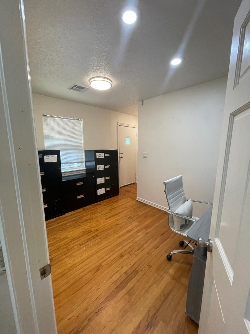 Office space available for lease 10/01/2025. This is a great space with a large reception area, conference room, 2 private offices, large kitchen area, 1 full bath, 2 1/2 baths, lots of options here! Fenced backyard with a large storage building. This property has been recently updated with interior and exterior paint, cedar beams, shutters, and more. $1,500 a month.